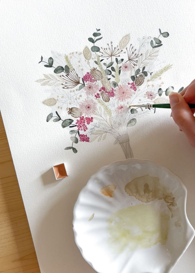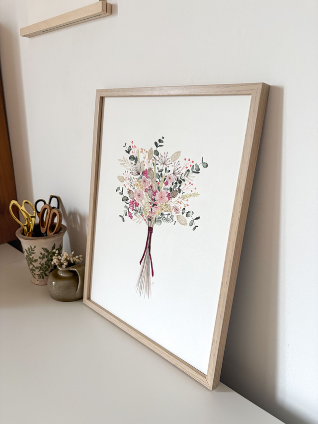 Bouquet de fleurs séchées réalisé à l'aquarelle sur du papier 100% coton, 300g/m2
