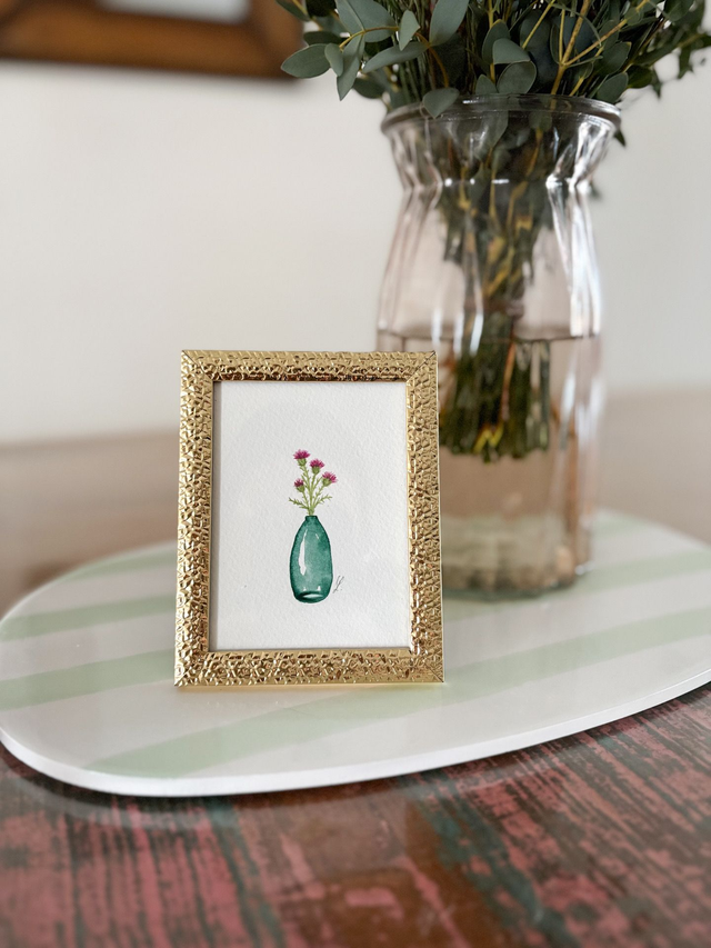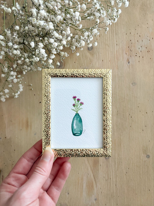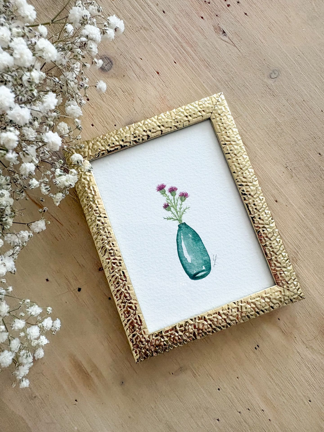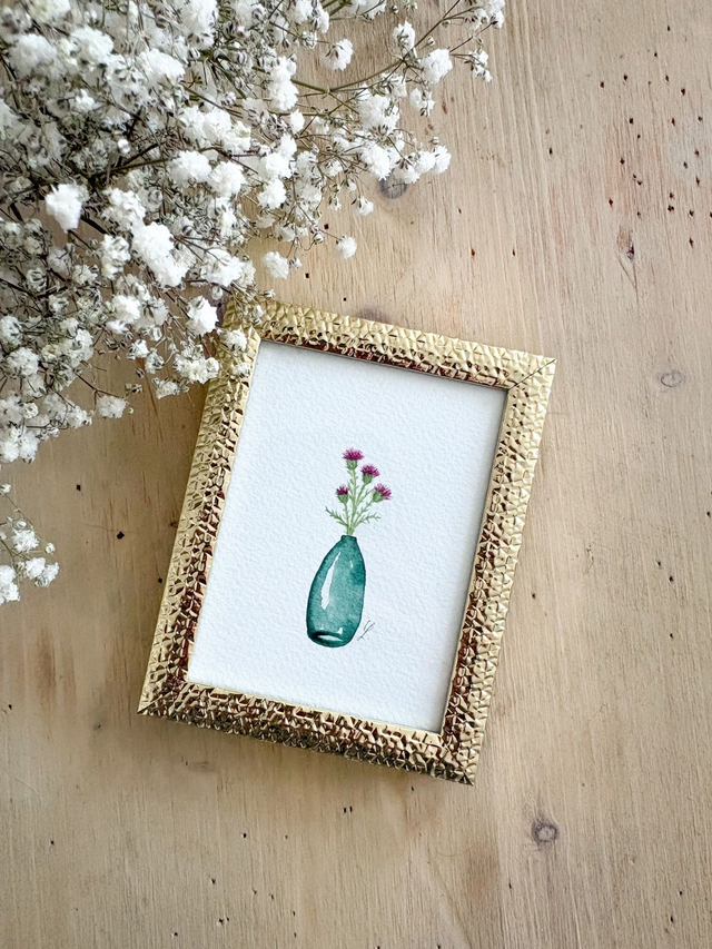 Aquarelle originale - Cadre doré miniature avec vase et chardons lorrains